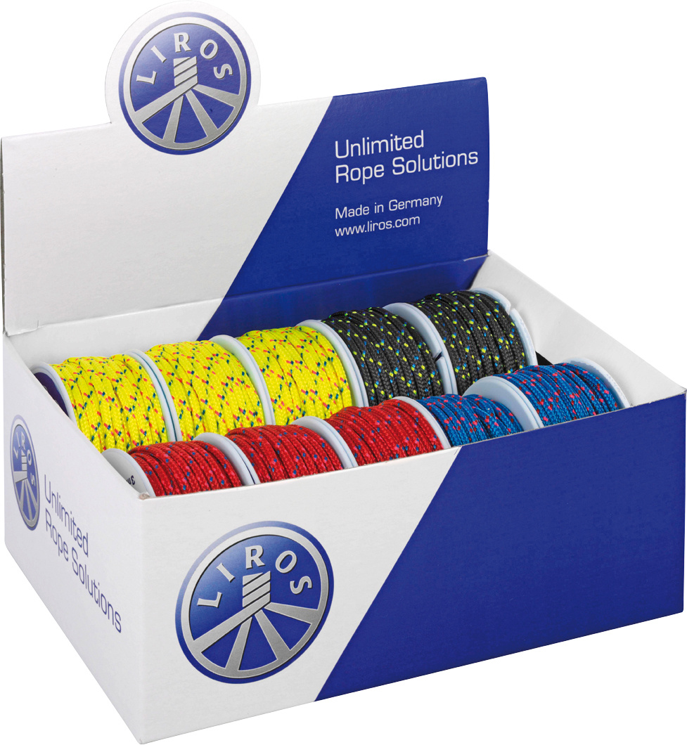 Polyesterflechtschnüre, sortiert im LIROS-Verkaufskarton, in verschiedenen Farben.